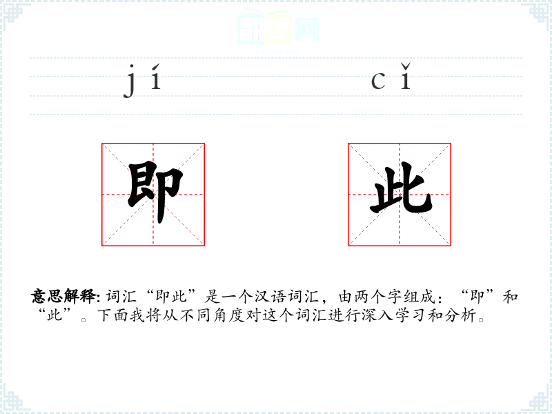 词汇“即此”是一个汉语词汇,由两个字组成:“即”和“此”。下面我将从不同角度对这个词汇进行深入学*和分析。