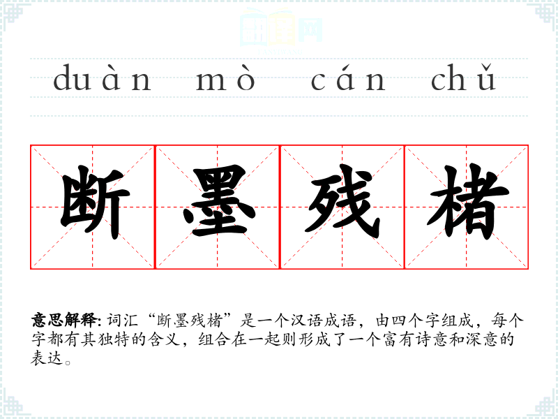 词汇“断墨残楮”是一个汉语成语,由四个字组成,每个字都有其独特的含义,组合在一起则形成了一个富有诗意和深意的表达。