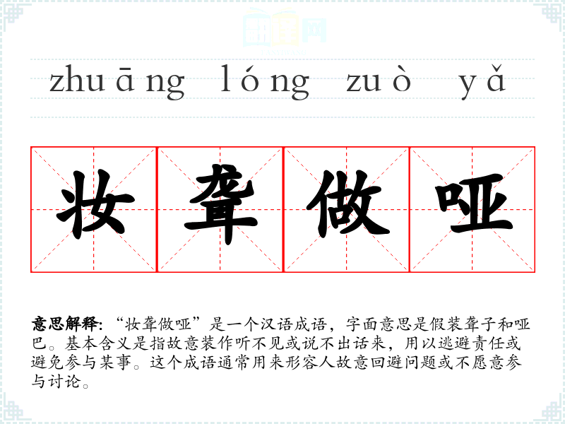 “妆聋做哑”是一个汉语成语,字面意思是假装聋子和哑巴。基本含义是指故意装作听不见或说不出话来,用以逃避责任或避免参与某事。这个成语通常用来形容人故意回避问题或不愿意参与讨论。