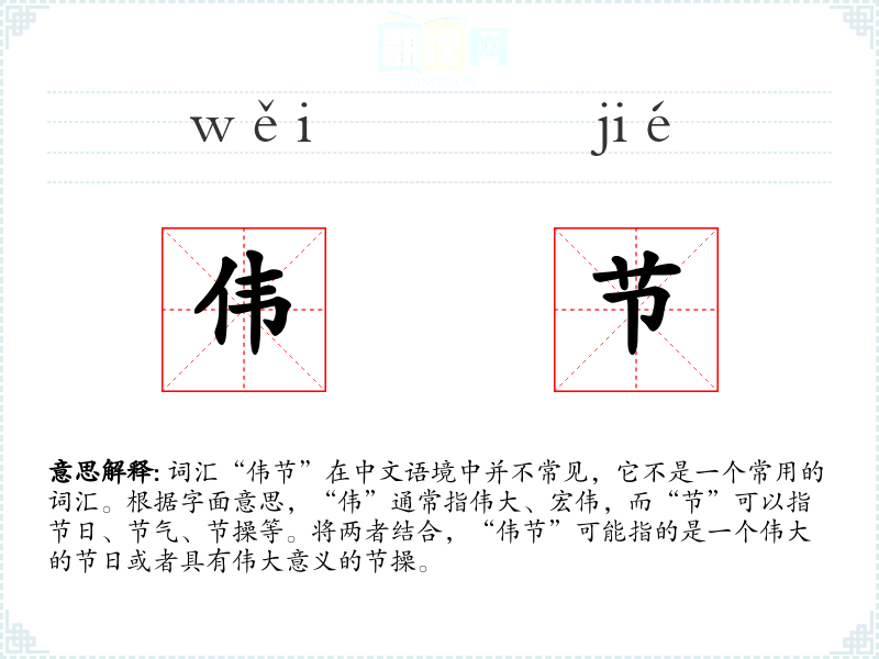 在特定的文化或社会背景中,“伟节”可能用来强调某个节日的特殊意义,如国庆节、春节等。