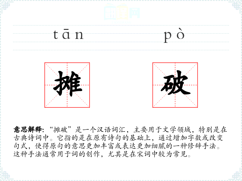“摊破”一词源自古代文人对诗词的创作和修改过程,特别是在宋代,词的创作达到了高峰,词人们为了更好地表达情感和意境,常常对原有的诗句进行修改和扩展,形成了“摊破”这一修辞手法。