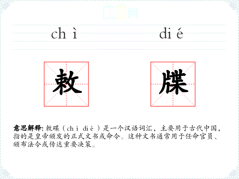 敕碟(chì dié)是一个汉语词汇,主要用于古代,指的是颁发的正式文书或命令。这种文书通常用于任命官员、颁布法令或传达重要决策。