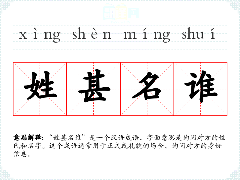 “姓甚名谁”是一个汉语成语,字面意思是询问对方的姓氏和名字。这个成语通常用于正式或礼貌的场合,询问对方的身份信息。