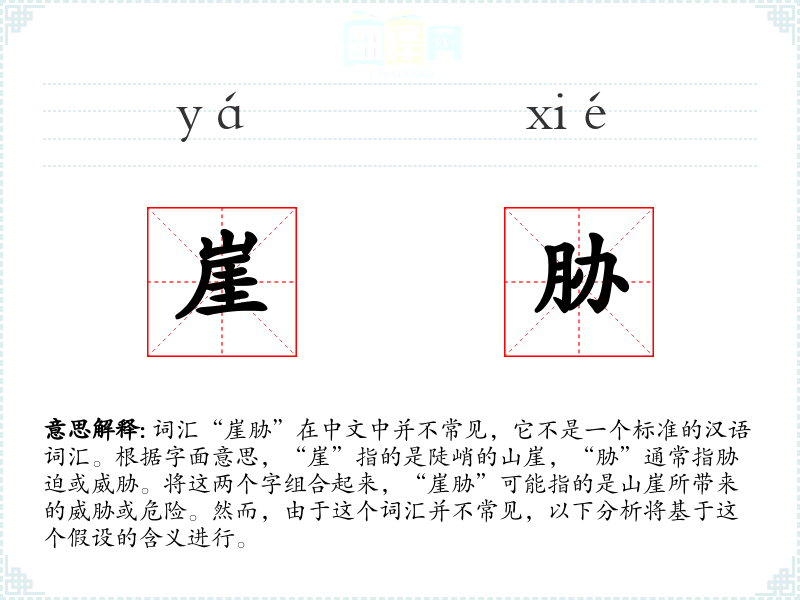词汇“崖胁”在中文中并不常见,它不是一个标准的汉语词汇。根据字面意思,“崖”指的是陡峭的山崖,“胁”通常指胁迫或威胁。将这两个字组合起来,“崖胁”可能指的是山崖所带来的威胁或危险。然而,由于这个词汇并不常见,以下分析将基于这个假设的含义进行。