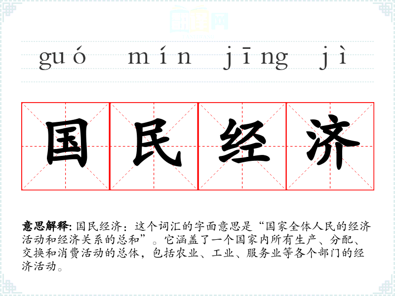 国民经济:这个词汇的字面意思是“国家全体人民的经济活动和经济关系的总和”。它涵盖了一个国家内所有生产、分配、交换和消费活动的总体,包括农业、工业、服务业等各个部门的经济活动。