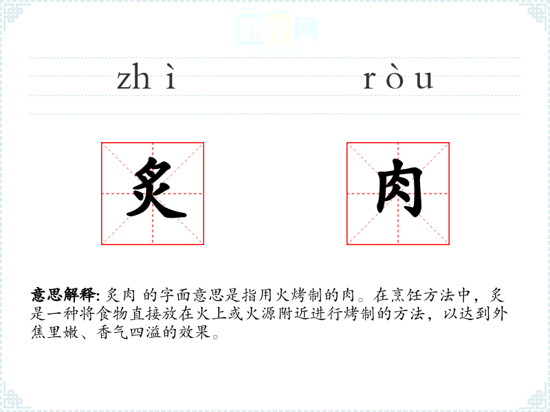 炙肉 的字面意思是指用火烤制的肉。在烹饪方法中,炙是一种将食物直接放在火上或火源附近进行烤制的方法,以达到外焦里嫩、香气四溢的效果。