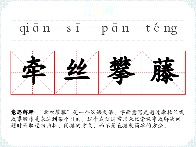 “牵丝攀藤”是一个汉语成语,字面意思是通过牵拉丝线或攀爬藤蔓来达到某个目的。这个成语通常用来比喻做事或解决问题时采取迂回曲折、间接的方式,而不是直接或简单的方法。