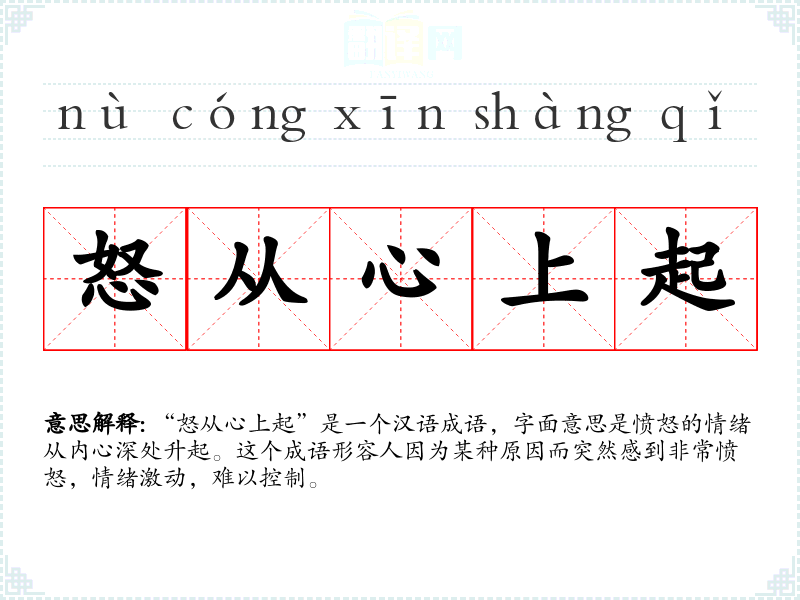 “怒从心上起”是一个汉语成语,字面意思是愤怒的情绪从内心深处升起。这个成语形容人因为某种原因而突然感到非常愤怒,情绪激动,难以控制。
