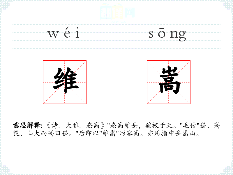 《诗.大雅.崧高》"崧高维岳,骏极于天。"毛传"崧,高貌,山大而高曰崧。"后即以"维嵩"形容高。亦用指中岳嵩山。