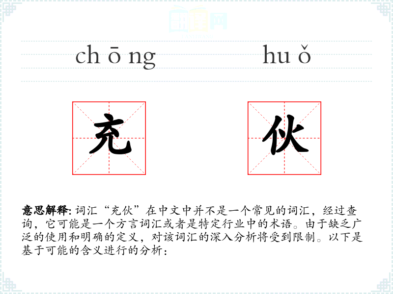 词汇“充伙”在中文中并不是一个常见的词汇,经过查询,它可能是一个方言词汇或者是特定行业中的术语。由于缺乏广泛的使用和明确的定义,对该词汇的深入分析将受到限制。以下是基于可能的含义进行的分析: