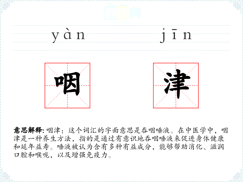 咽津的词源较为直接,由“咽”(吞咽)和“津”(唾液)两个字组成。在古代中医文献中,咽津的概念就已经存在,并且一直沿用至今。