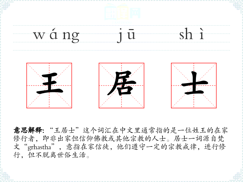 “王居士”这个词汇在中文里通常指的是一位姓王的在家修行者,即非出家但信仰或其他的人士。居士一词源自梵文“grhastha”,意指在家信徒,他们遵守一定的**戒律,进行修行,但不脱离世俗生活。