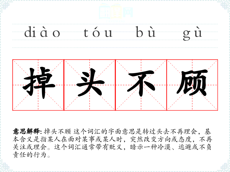 掉头不顾 这个词汇的字面意思是转过头去不再理会,基本含义是指某人在面对某事或某人时,突然改变方向或态度,不再关注或理会。这个词汇通常带有贬义,暗示一种冷漠、逃避或不负责任的行为。