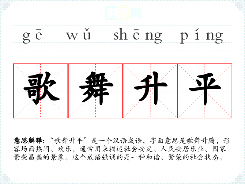 “歌舞升平”是一个汉语成语,字面意思是歌舞升腾,形容场面热闹、欢乐,通常用来描述社会安定、人民安居乐业、国家繁荣昌盛的景象。这个成语强调的是一种和谐、繁荣的社会状态。