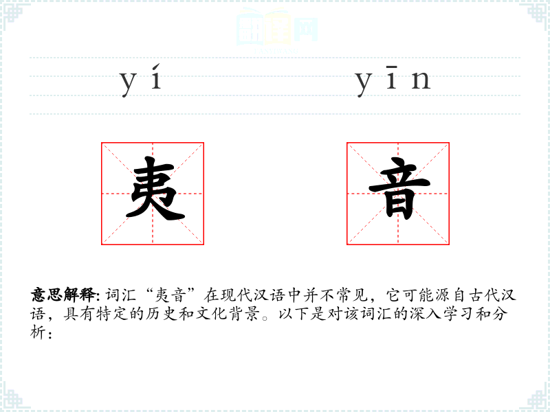 词汇“夷音”在现代汉语中并不常见,它可能源自古代汉语,具有特定的历史和文化背景。以下是对该词汇的深入学*和分析: