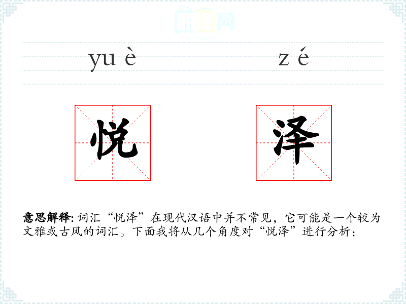 词汇“悦泽”在现代汉语中并不常见,它可能是一个较为文雅或古风的词汇。下面我将从几个角度对“悦泽”进行分析: