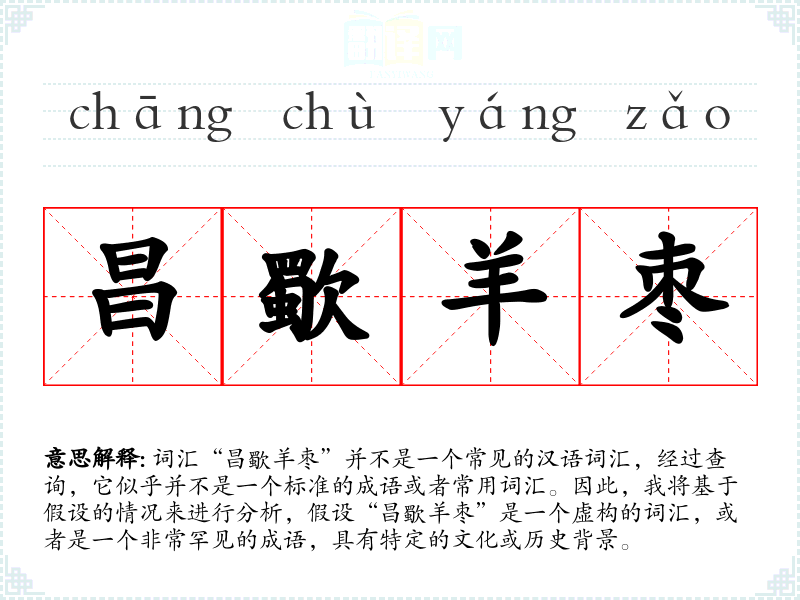 词汇“昌歜羊枣”并不是一个常见的汉语词汇,经过查询,它似乎并不是一个标准的成语或者常用词汇。因此,我将基于假设的情况来进行分析,假设“昌歜羊枣”是一个虚构的词汇,或者是一个非常罕见的成语,具有特定的文化或历史背景。