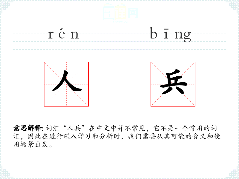 词汇“人兵”在中文中并不常见,它不是一个常用的词汇,因此在进行深入学*和分析时,我们需要从其可能的含义和使用场景出发。