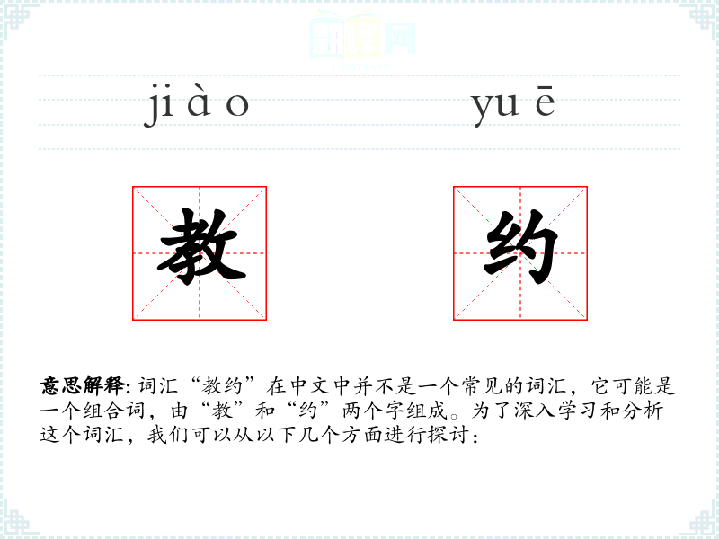 - 反义词:无(由于“教约”不是一个常用词汇,反义词可能不明显)