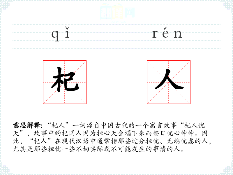 - 专业领域:在心理学领域,“杞人”可能与焦虑症患者的某些行为特征相联系。