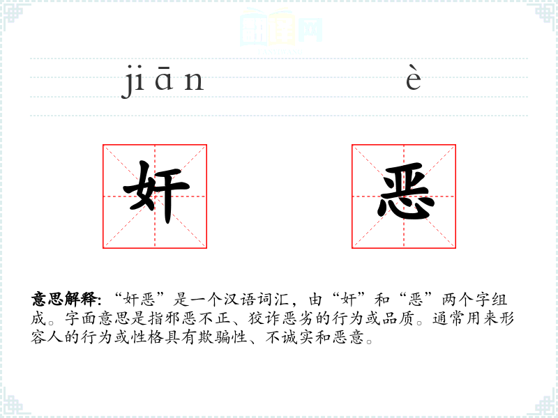 “奸恶”是一个汉语词汇,由“奸”和“恶”两个字组成。字面意思是指邪恶不正、狡诈恶劣的行为或品质。通常用来形容人的行为或性格具有欺骗性、不诚实和恶意。
