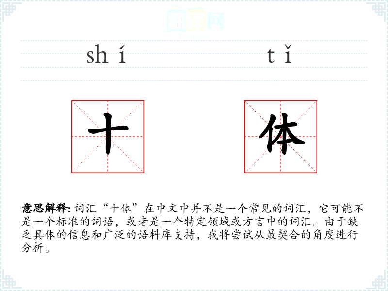词汇“十体”在中文中并不是一个常见的词汇,它可能不是一个标准的词语,或者是一个特定领域或方言中的词汇。由于缺乏具体的信息和广泛的语料库支持,我将尝试从最契合的角度进行分析。