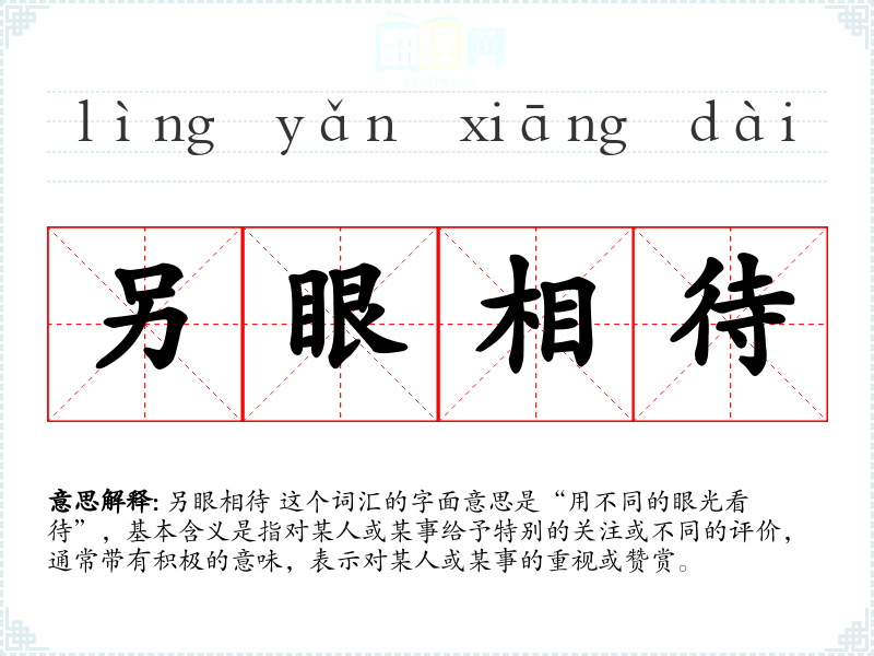另眼相待 这个词汇的字面意思是“用不同的眼光看待”,基本含义是指对某人或某事给予特别的关注或不同的评价,通常带有积极的意味,表示对某人或某事的重视或赞赏。