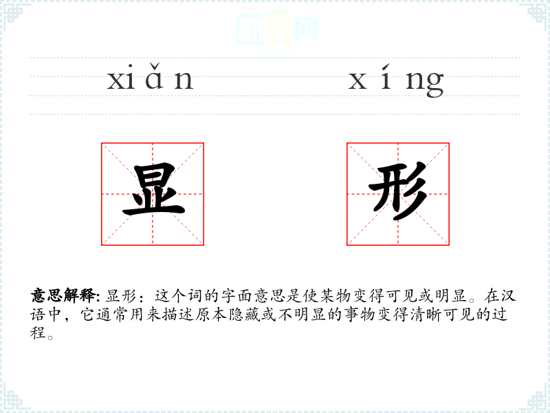 显形:这个词的字面意思是使某物变得可见或明显。在汉语中,它通常用来描述原本隐藏或不明显的事物变得清晰可见的过程。