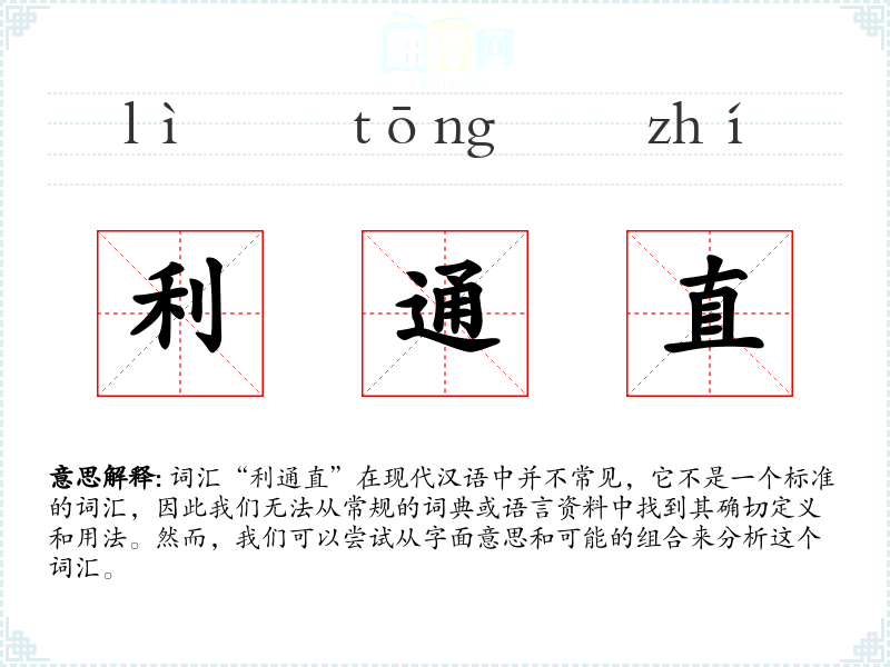 词汇“利通直”在现代汉语中并不常见,它不是一个标准的词汇,因此我们无法从常规的词典或语言资料中找到其确切定义和用法。然而,我们可以尝试从字面意思和可能的组合来分析这个词汇。