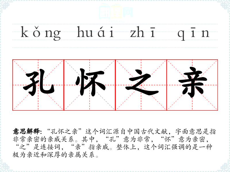 “孔怀之亲”这个词汇源自**古代文献,字面意思是指非常亲密的亲戚关系。其中,“孔”意为非常,“怀”意为亲密,“之”是连接词,“亲”指亲戚。整体上,这个词汇强调的是一种极为亲近和深厚的亲属关系。