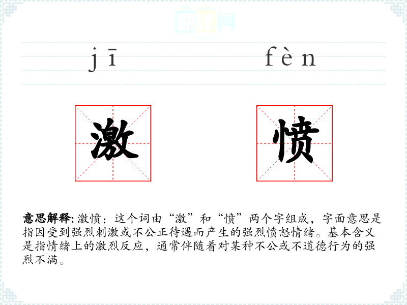 激愤:这个词由“激”和“愤”两个字组成,字面意思是指因受到强烈刺激或不公正待遇而产生的强烈愤怒情绪。基本含义是指情绪上的激烈反应,通常伴随着对某种不公或不道德行为的强烈不满。