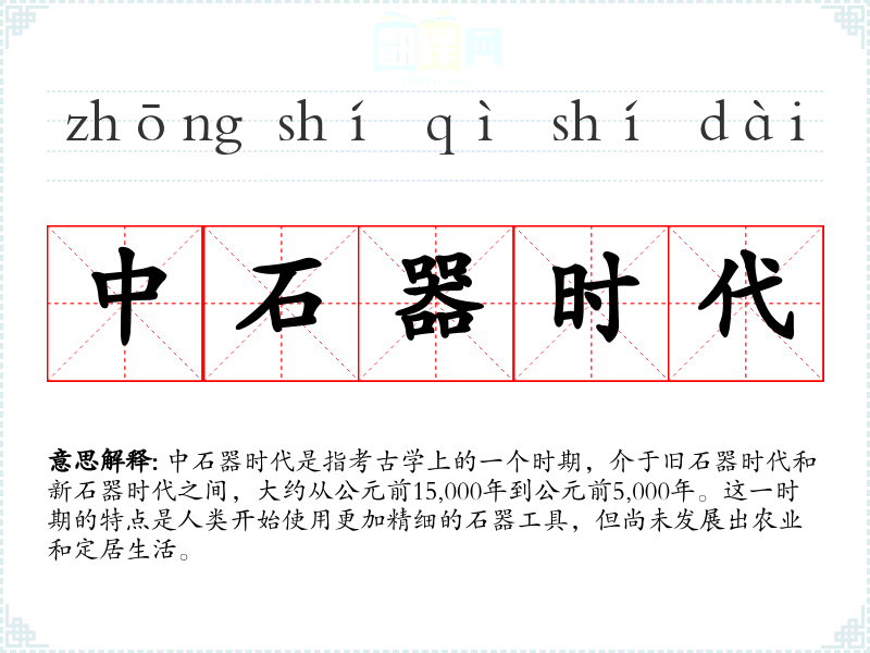 中石器时代是指考古学上的一个时期,介于旧石器时代和新石器时代之间,大约从公元前15,000年到公元前5,000年。这一时期的特点是人类开始使用更加精细的石器工具,但尚未发展出农业和定居生活。