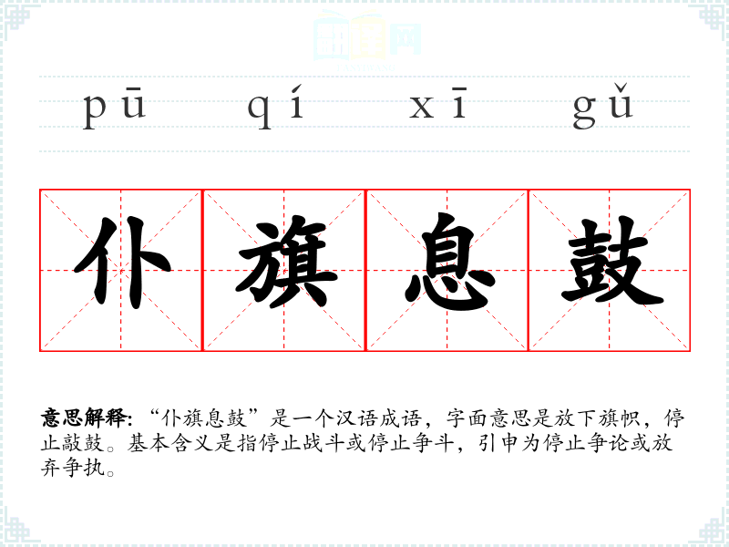 “仆旗息鼓”是一个汉语成语,字面意思是放下旗帜,停止敲鼓。基本含义是指停止战斗或停止争斗,引申为停止争论或放弃争执。