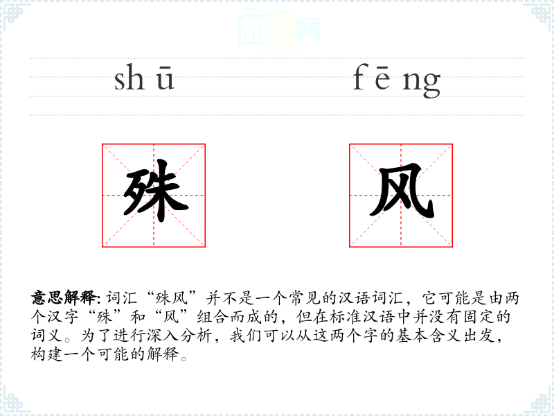 词汇“殊风”并不是一个常见的汉语词汇,它可能是由两个汉字“殊”和“风”组合而成的,但在标准汉语中并没有固定的词义。为了进行深入分析,我们可以从这两个字的基本含义出发,构建一个可能的解释。