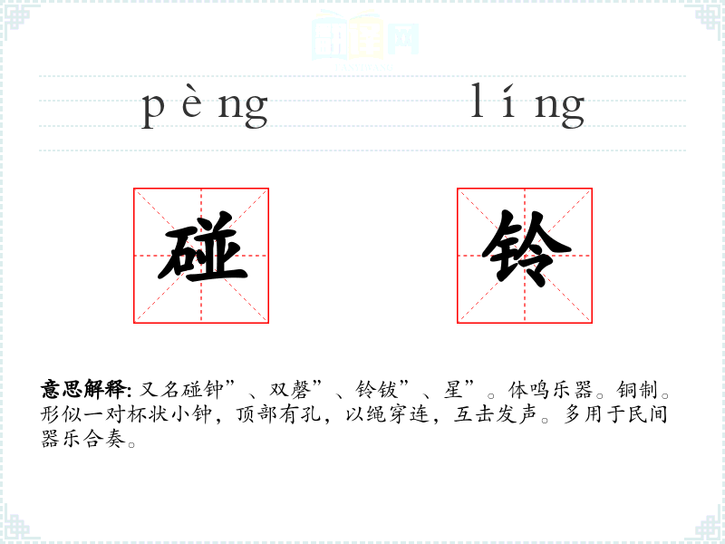 又名碰钟”、双磬”、铃钹”、星”。体鸣乐器。铜制。形似一对杯状小钟,顶部有孔,以绳穿连,互击发声。多用于民间器乐合奏。