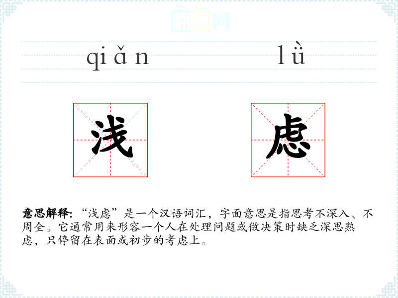 “浅虑”由“浅”和“虑”两个字组成。“浅”字本义为水不深,引申为不深入、不全面。“虑”字本义为思考、考虑。两个字组合起来,形成了“浅虑”这个词汇,用来形容思考的不深入。