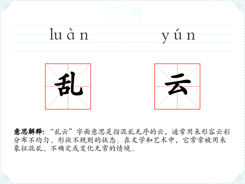 “乱云”字面意思是指混乱无序的云,通常用来形容云彩分布不均匀、形状不规则的状态。在文学和艺术中,它常常被用来象征混乱、不确定或变化无常的情境。