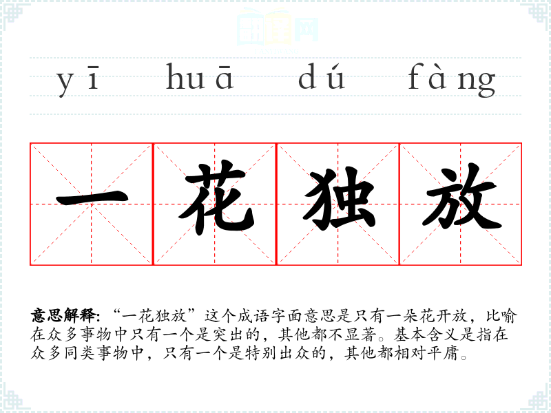 “一花独放”这个成语字面意思是只有一朵花开放,比喻在众多事物中只有一个是突出的,其他都不显著。基本含义是指在众多同类事物中,只有一个是特别出众的,其他都相对平庸。