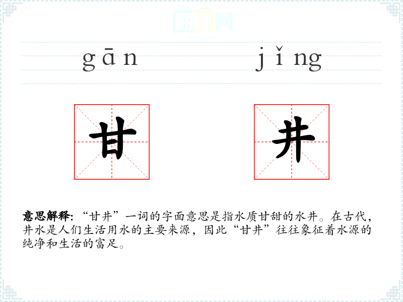 “甘井”一词的字面意思是指水质甘甜的水井。在古代,井水是人们生活用水的主要来源,因此“甘井”往往象征着水源的纯净和生活的富足。