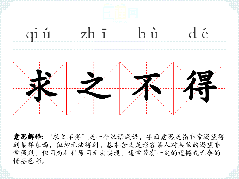 “求之不得”是一个汉语成语,字面意思是指非常渴望得到某样东西,但却无法得到。基本含义是形容某人对某物的渴望非常强烈,但因为种种原因无法实现,通常带有一定的遗憾或无奈的情感色彩。
