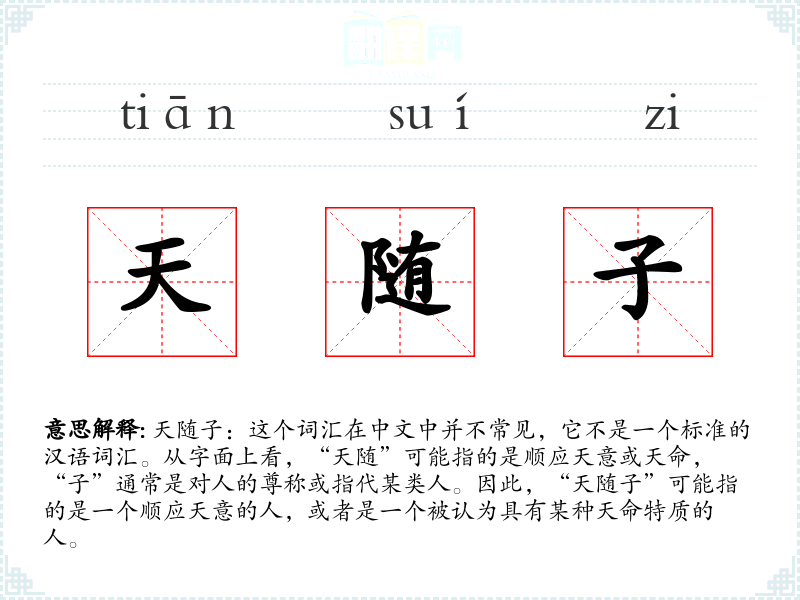 天随子:这个词汇在中文中并不常见,它不是一个标准的汉语词汇。从字面上看,“天随”可能指的是顺应天意或天命,“子”通常是对人的尊称或指代某类人。因此,“天随子”可能指的是一个顺应天意的人,或者是一个被认为具有某种天命特质的人。