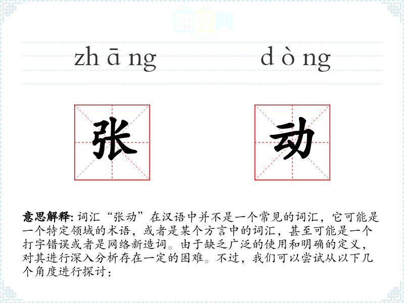 由于“张动”不是一个标准汉语词汇,我们无法给出确切的基本定义。它可能是由“张”和“动”两个字组合而成的新词,其中“张”可以有展开、扩张的意思,而“动”则表示移动、变化。