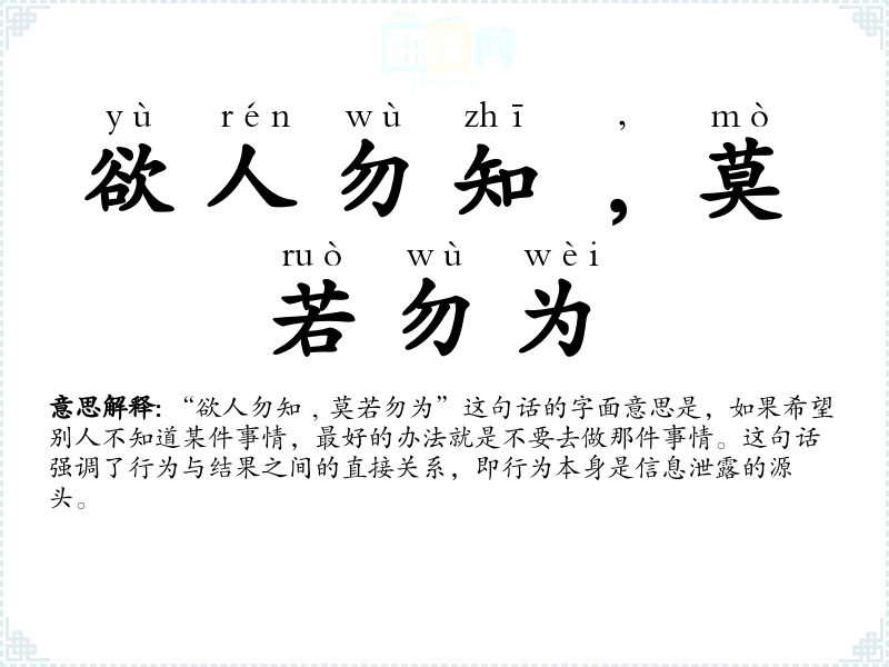 “欲人勿知﹐莫若勿为”这句话的字面意思是,如果希望别人不知道某件事情,最好的办法就是不要去做那件事情。这句话强调了行为与结果之间的直接关系,即行为本身是信息泄露的源头。