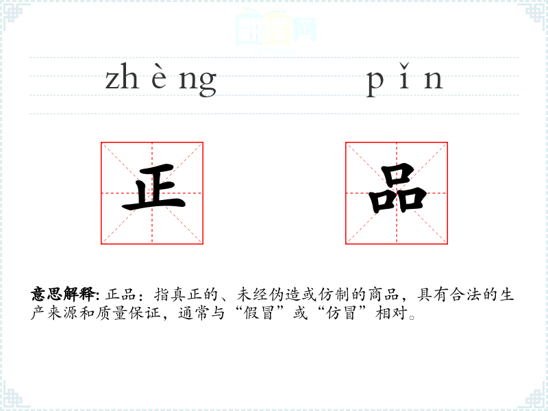 正品:指真正的、未经伪造或仿制的商品,具有合法的生产来源和质量保证,通常与“假冒”或“仿冒”相对。