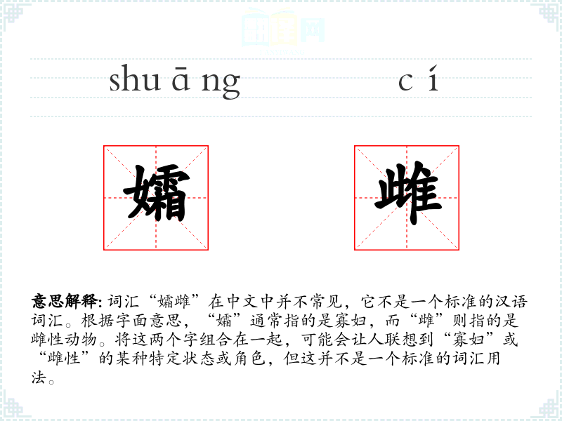同义词与反义词方面,由于“孀雌”不是一个标准词汇,我们无法提供相关的同义词和反义词。