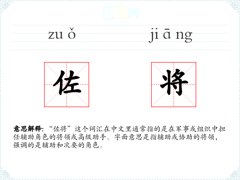 “佐将”这个词汇在中文里通常指的是在军事或组织中担任辅助角色的将领或高级助手。字面意思是指辅助或协助的将领,强调的是辅助和次要的角色。