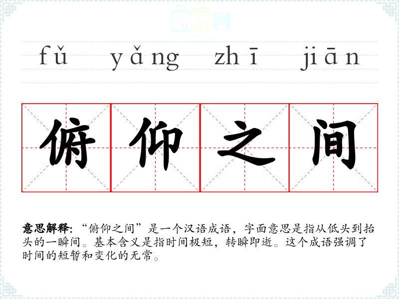- 细微差别:这些同义词都强调时间的短暂和变化的速度,但“俯仰之间”更侧重于从一种状态到另一种状态的快速转变。
