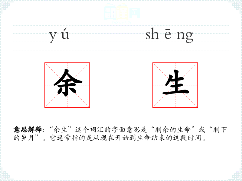 “余生”这个词汇的字面意思是“剩余的生命”或“剩下的岁月”。它通常指的是从现在开始到生命结束的这段时间。