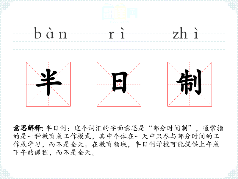 半日制:这个词汇的字面意思是“部分时间制”,通常指的是一种教育或工作模式,其中个体在一天中只参与部分时间的工作或学习,而不是全天。在教育领域,半日制学校可能提供上午或下午的课程,而不是全天。