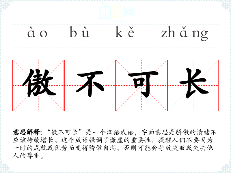 “傲不可长”是一个汉语成语,字面意思是骄傲的情绪不应该持续增长。这个成语强调了谦虚的重要性,提醒人们不要因为一时的成就或优势而变得骄傲自满,否则可能会导致失败或失去他人的尊重。